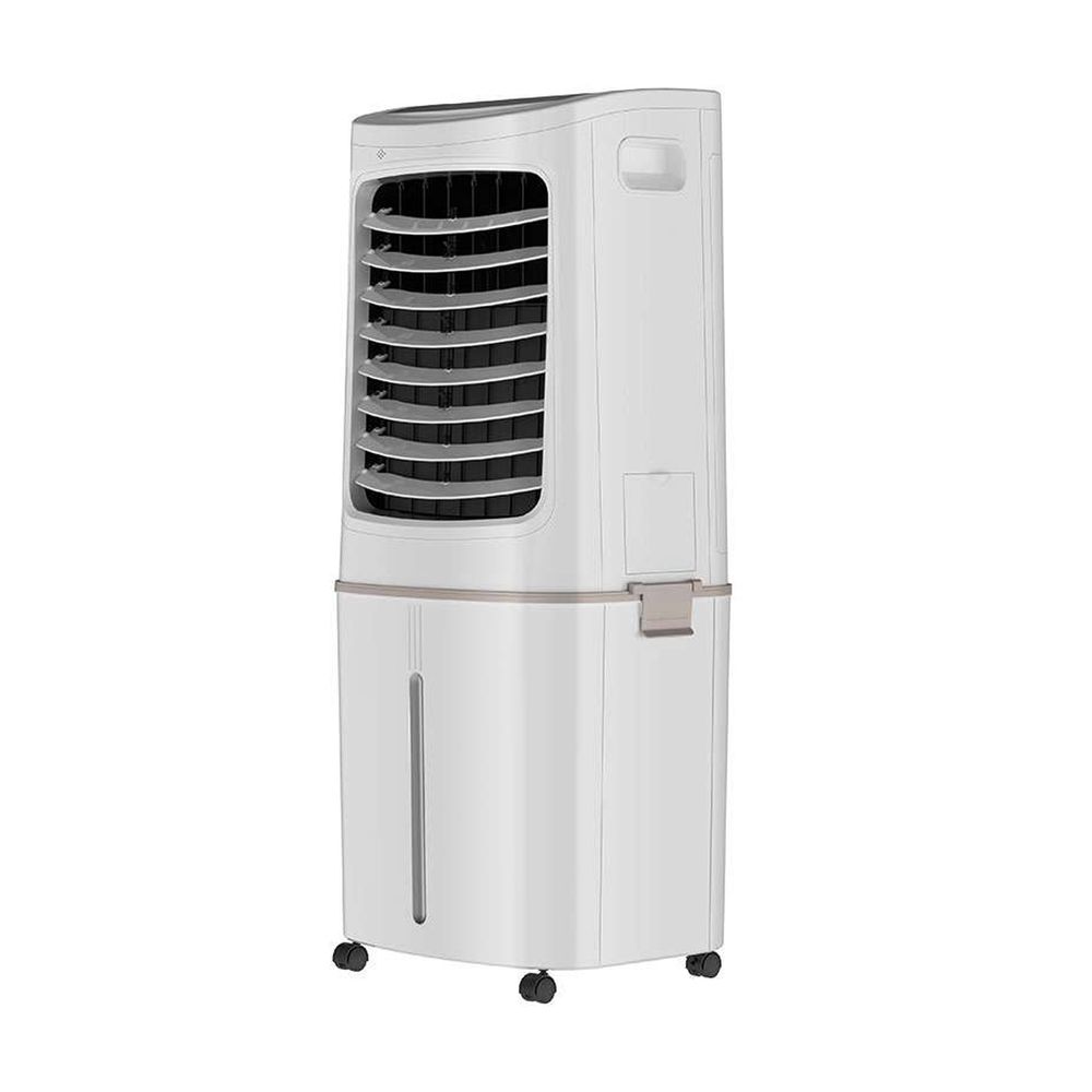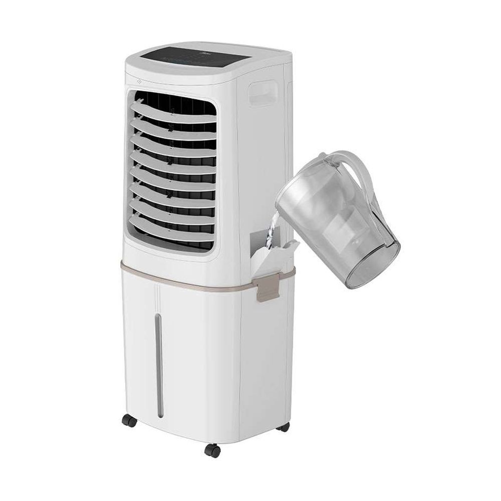 Air cooler Midea με ισχύ 200W, ροή αέρα 798 m³/h, 3 ταχύτητες, χρονοδιακόπτης 12 ωρών και χωρητικότητα δεξαμενής 50 lt. Με ροδάκια και λαβή για να μεταφέρεται εύκολα σε κάθε δωμάτιο.