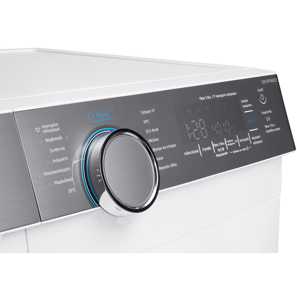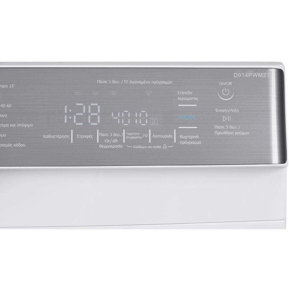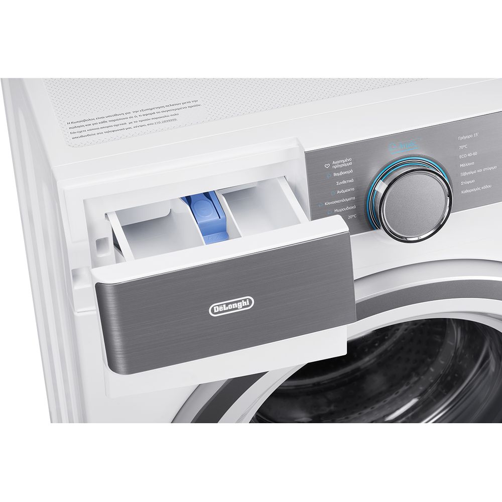 Πλυντήριο ρούχων Delonghi D914PWM23 χωρητικότητας 9 kg, 1400 στροφών με 14 προγράμματα πλύσης, αυτόματο ζύγισμα φορτίου και LED οθόνη ενδείξεων που σε ενημερώνει για την εξέλιξη της πλύσης.